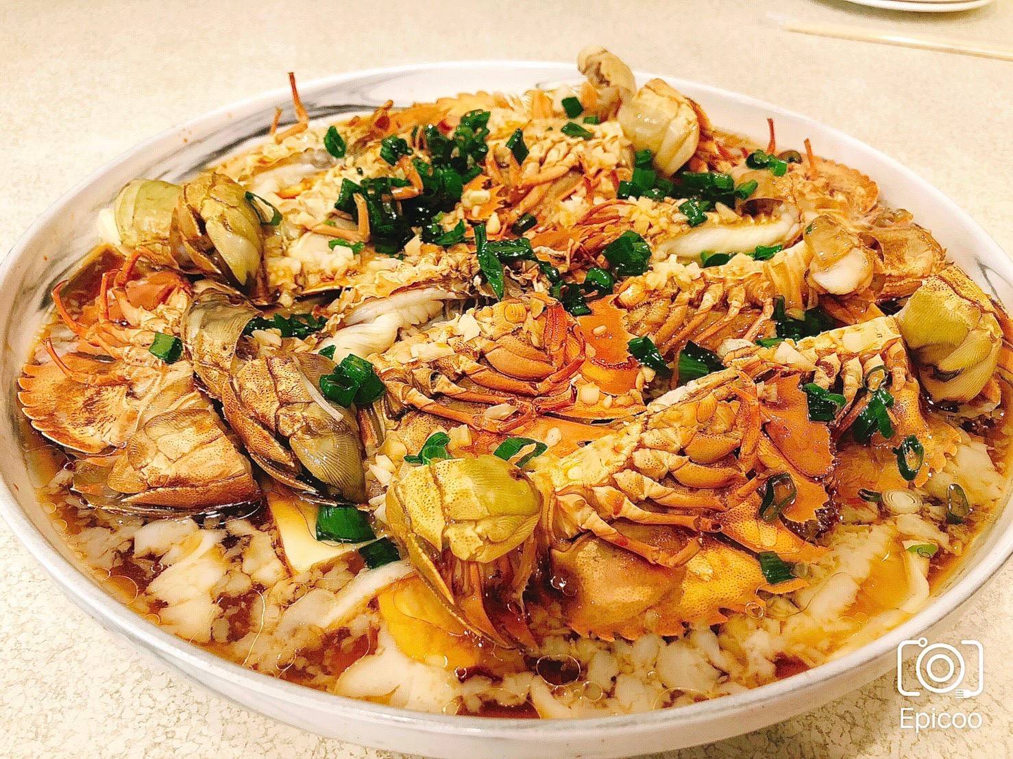 爆香蔥油搭配新鮮肥美龍蝦, 下飯又配酒,吮指鮮味, 高貴不貴活體龍蝦, 大啖一口,滿足滋味享受!