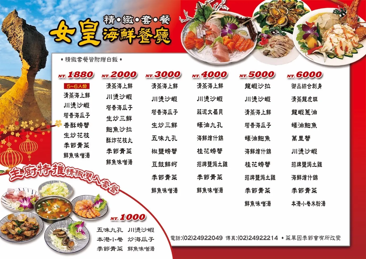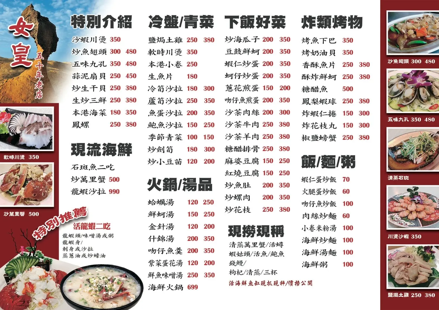 尤其針對許多來野柳旅遊的遊客,女皇餐廳提供的不只是一個輕鬆享用道地海鮮的空間,更是一個旅行途中印象深刻的回憶。店內的活海鮮都是現撈現秤,價格透明合理,遊客可以吃得更安心更放心。