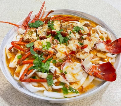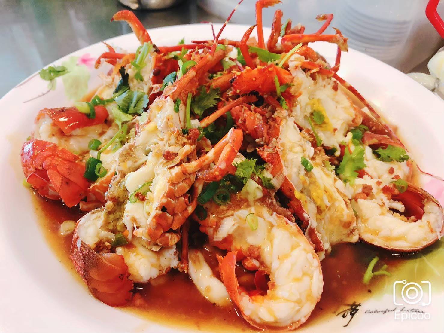 爆香蔥油搭配新鮮肥美龍蝦, 下飯又配酒,吮指鮮味, 高貴不貴活體龍蝦, 大啖一口,滿足滋味享受!